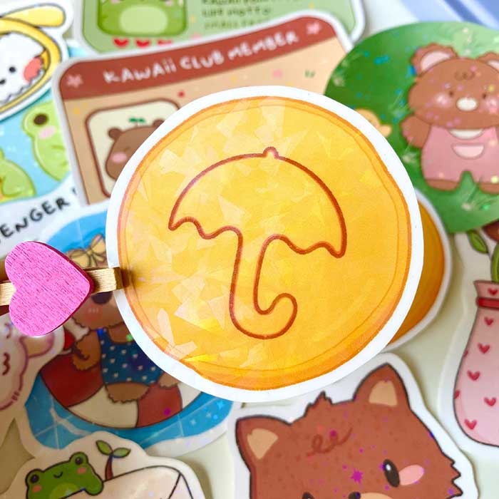 Pegatina hecha a mano con ilustración de la galleta con dibujo de paraguas de la serie coreana "El juego del calamar", el material es papel de vinilo cubierto con un film holográfico con brillos.