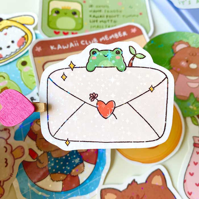 Pegatina hecha a mano con ilustración de un sobre blanco con una rana, el material es papel de vinilo cubierto con un film holográfico con brillos.